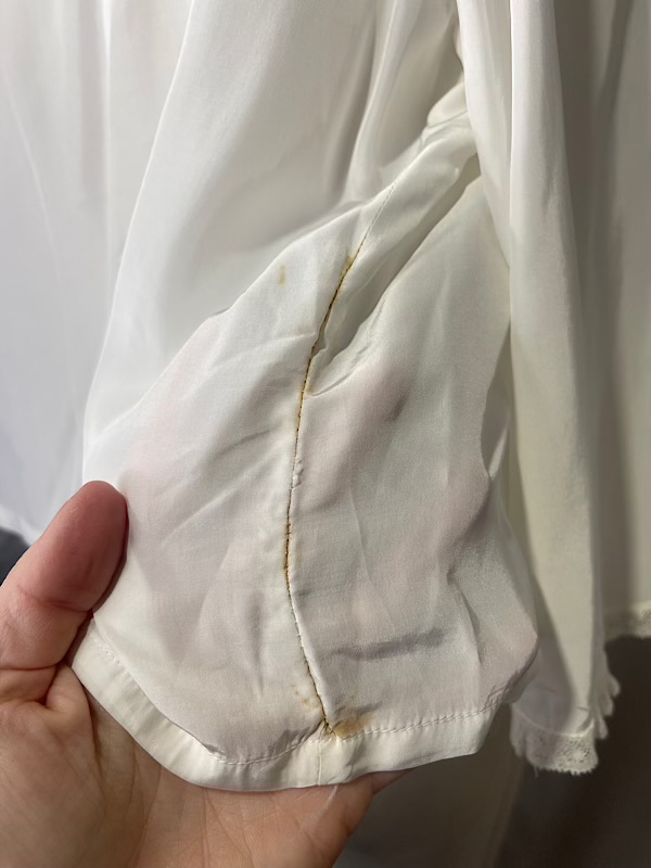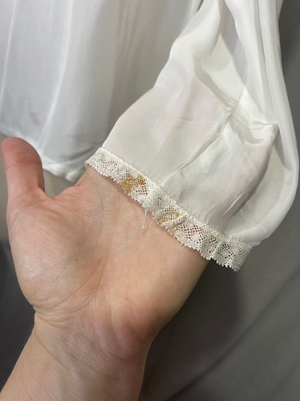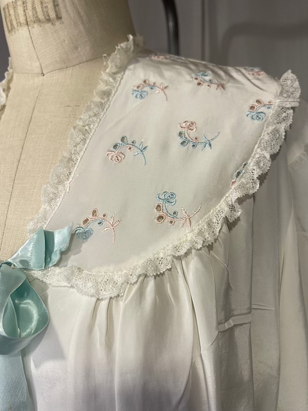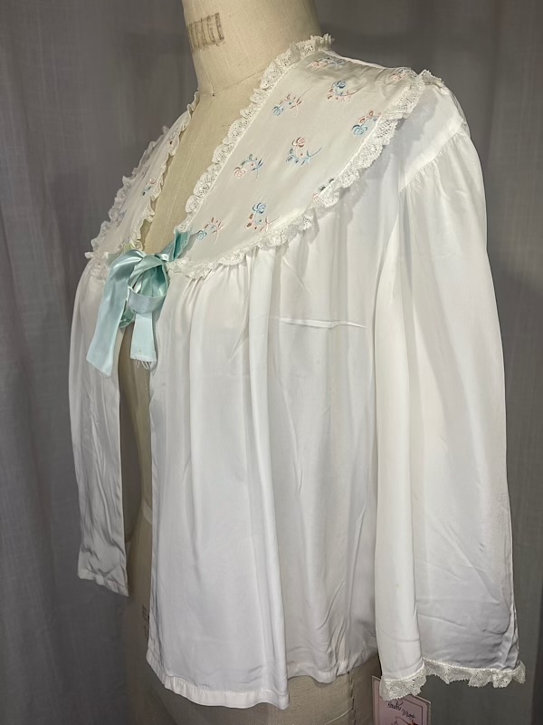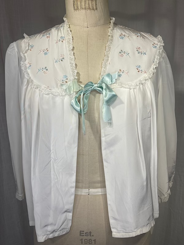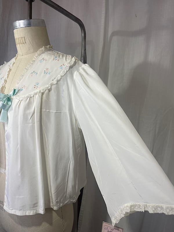 Very good condition. Beautiful cream silk bed jacket with pink and blue small floral embroidery. Blue satin bow closure. A few small faint stains throughout (see pics)