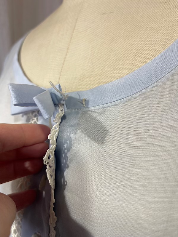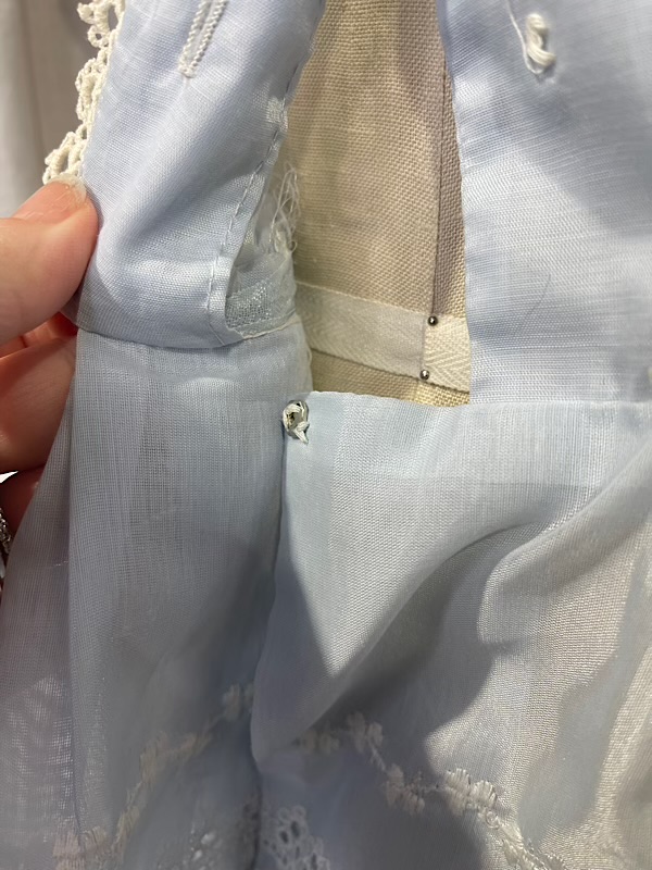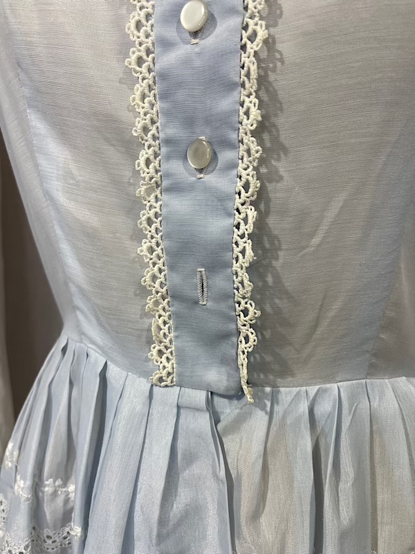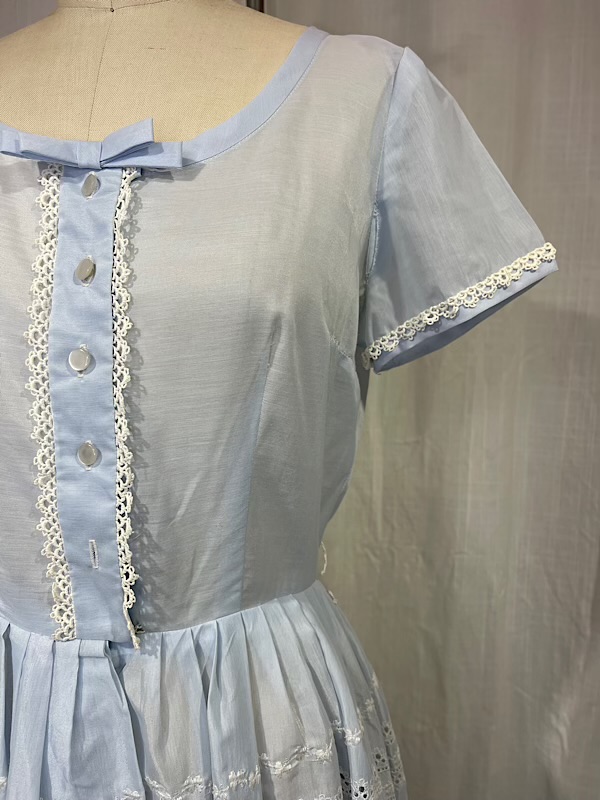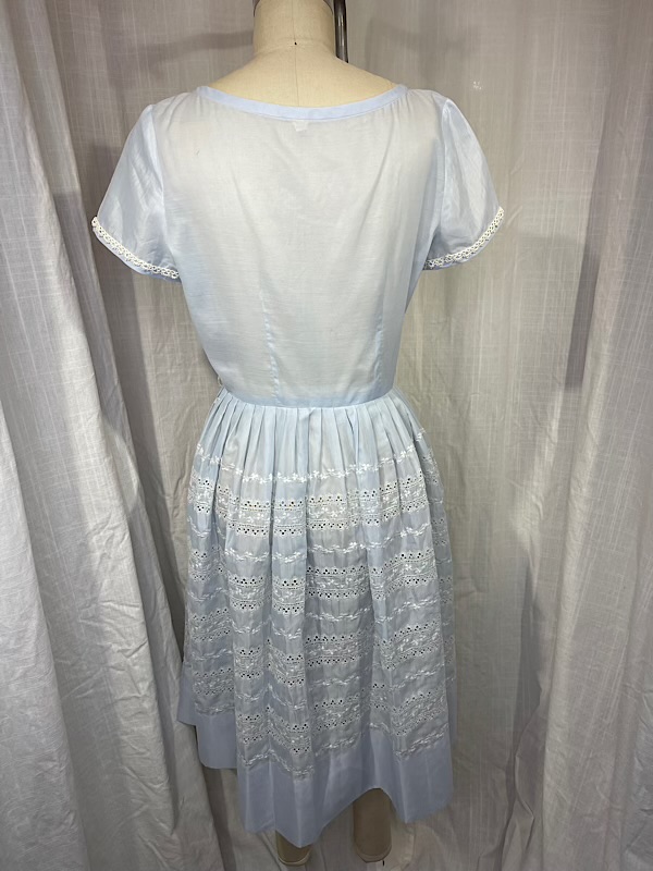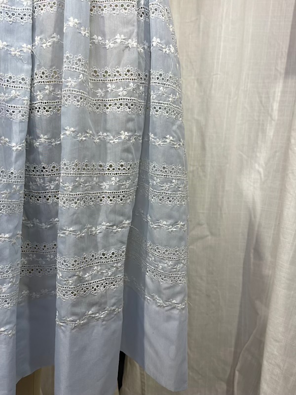 Excellent condition. Beautiful pale blue shirt dress with off-white eyelet skirt. Pleated skirt. Button closure on front. There are couple missing hook and eyes and one button (see pic.)