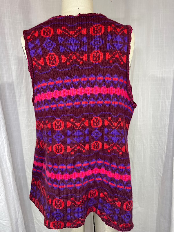 Good condition. Beautiful purple and pink magenta geometric design knit vest. Small hole on back (see pic)