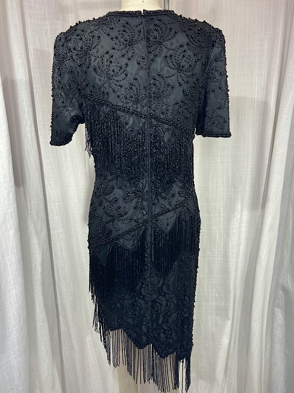 Vintage 80s Black Beaded and Fringe Cocotail Dress