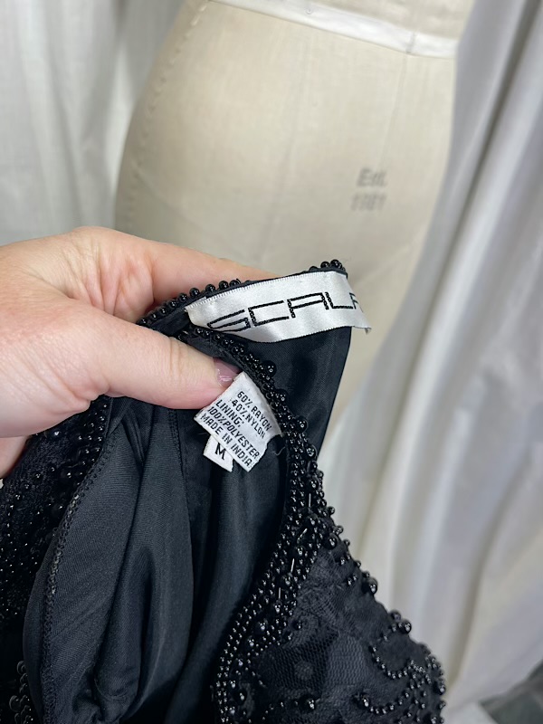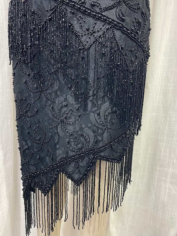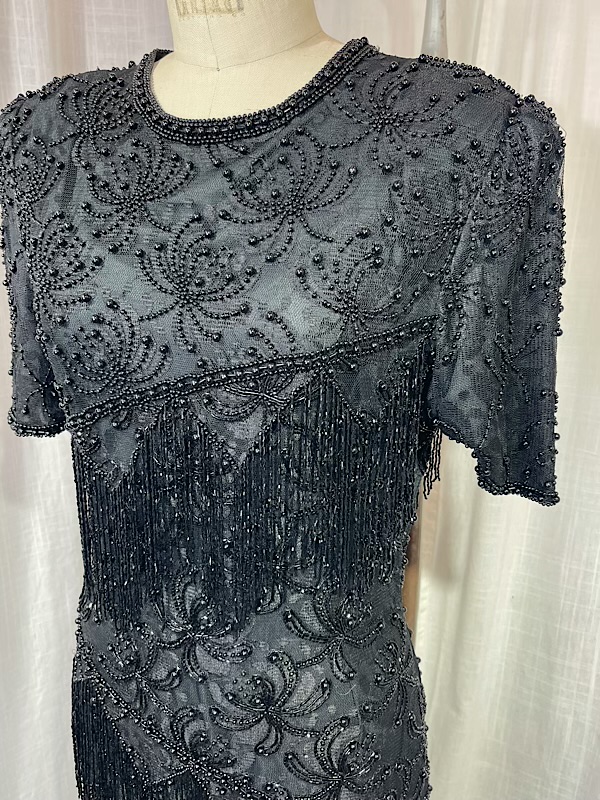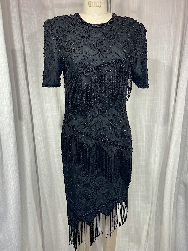 Very good condition. Beautiful black beaded asymmetrical cocktail dress with fringe layering. Shoulder pads. Fully lined. Center back zipper. Some missing and loose beads on fringe (see pics.)