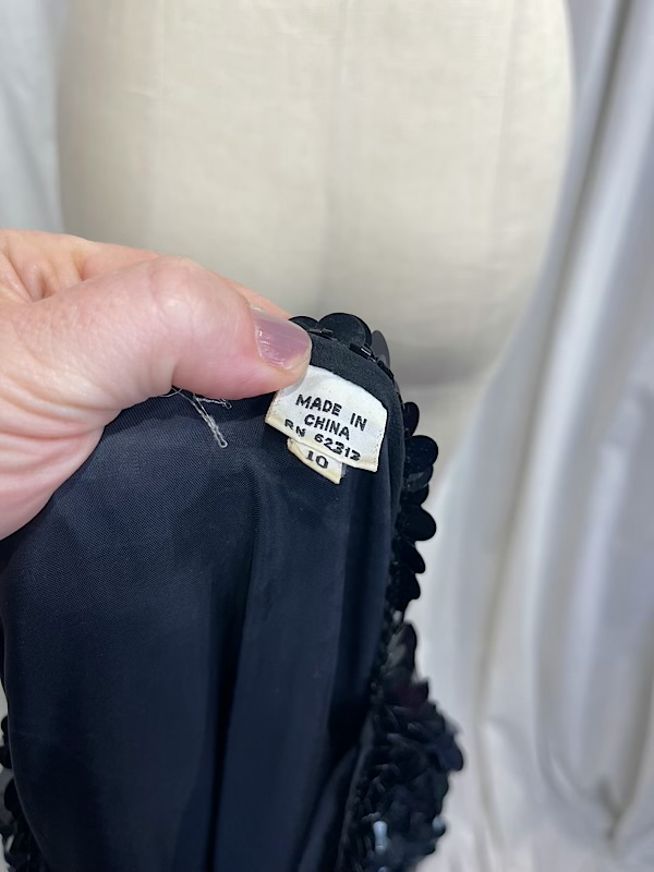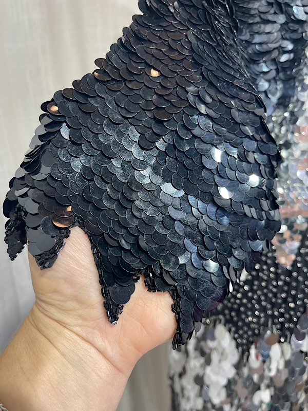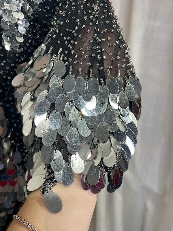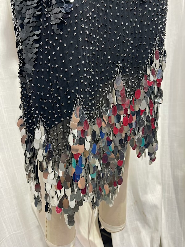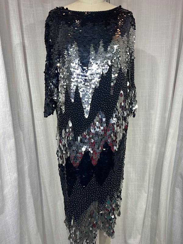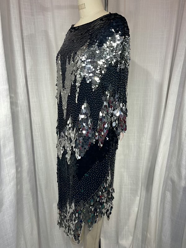 Excellent condition. Beautiful black and silver disc beaded asymmetrical cocktail dress. Bias cut. Dolman sleeves. Fully lined.