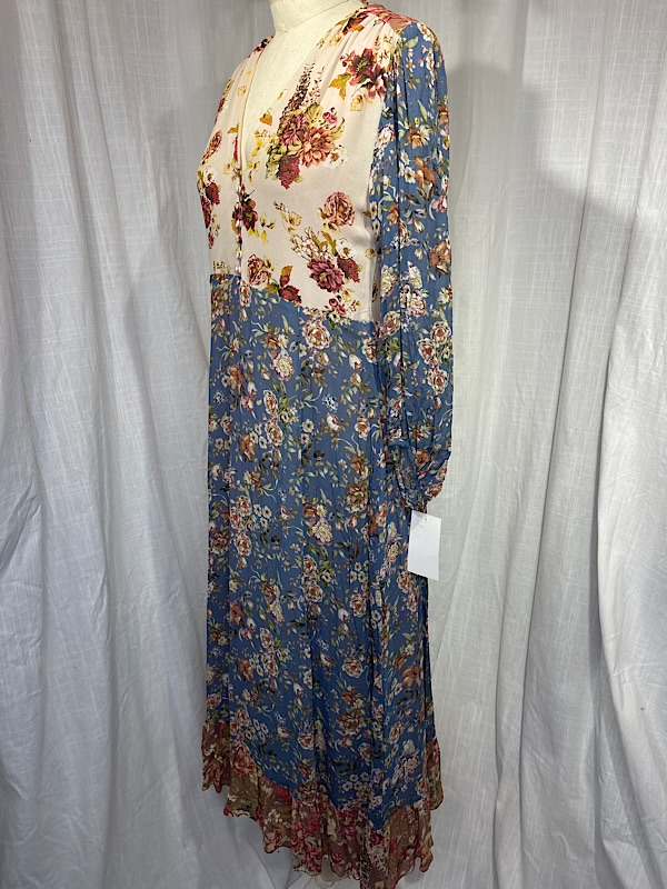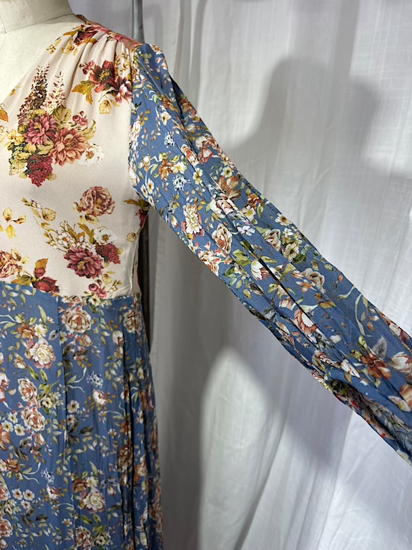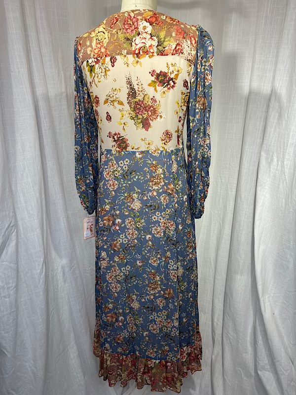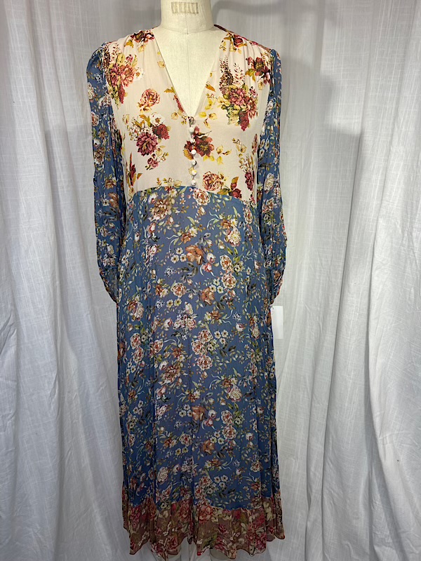 Excellent condition. Beautiful blue and beige flower print long maxi dress with long sleeves. Empire waist. Fully lined. Button closure on front.