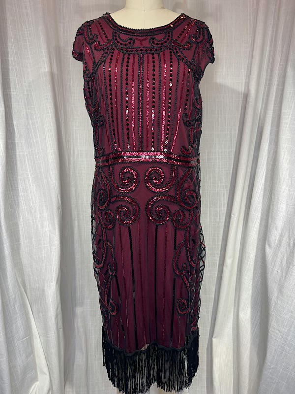 Excellent condition. Beautiful red/burgundy and black sequin drop waist dress with fringe trim. Fully lined. Side seam zipper.