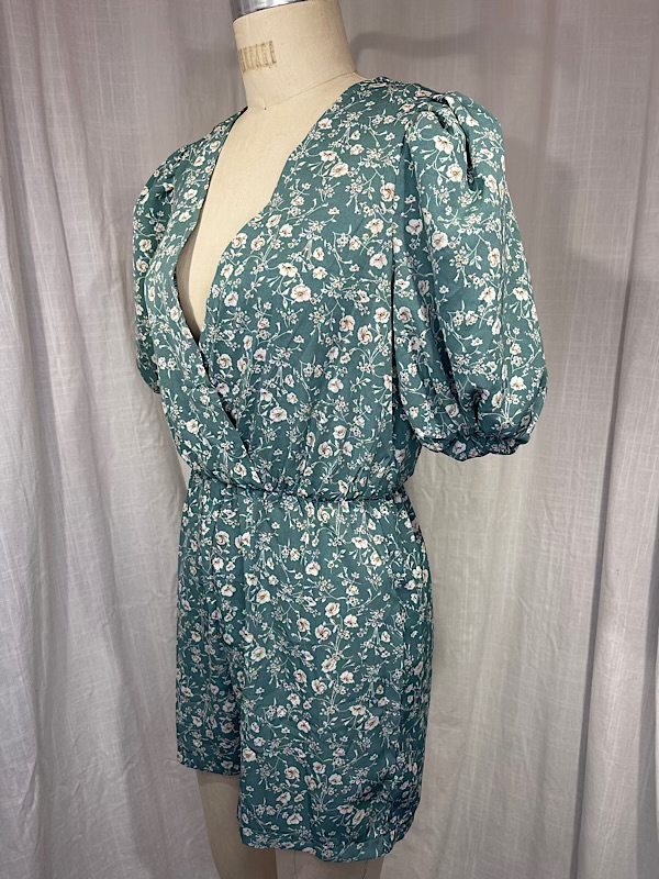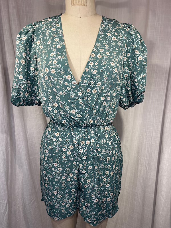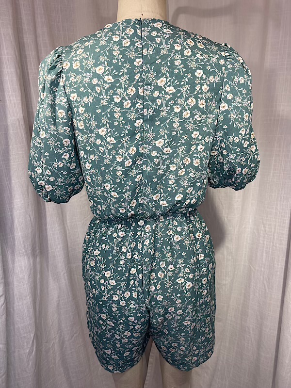 Excellent condition. Beautiful white small flower print green short romper with puff sleeves. Elastic waist band. Center back zipper.