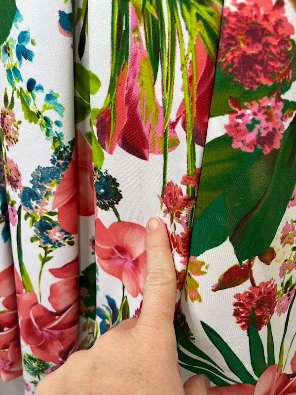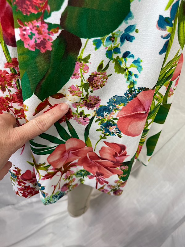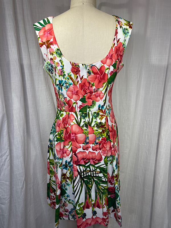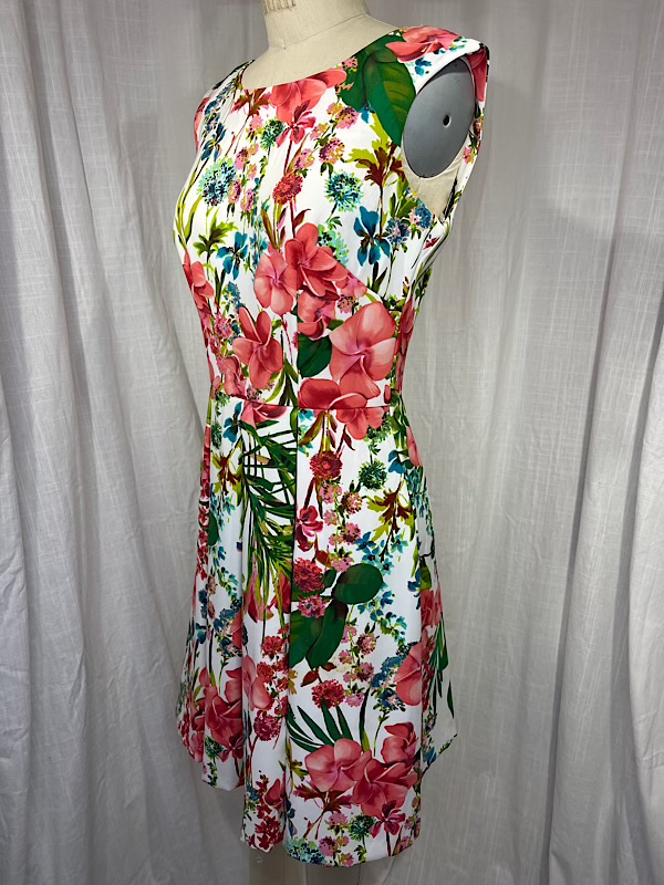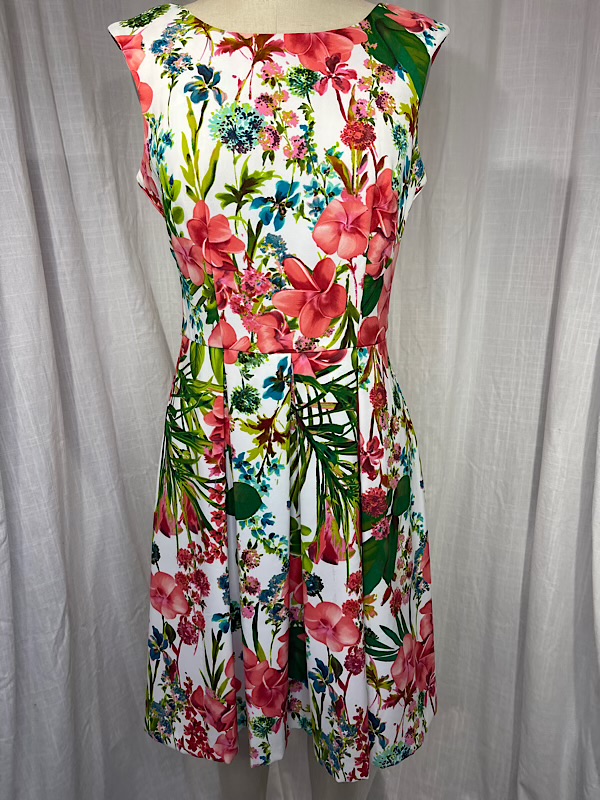 Good condition. Beautiful plumera/hibiscus and palm frond print box pleated dress. Center back zipper. A couple places with small somewhat hidden in the print spots (see pic)