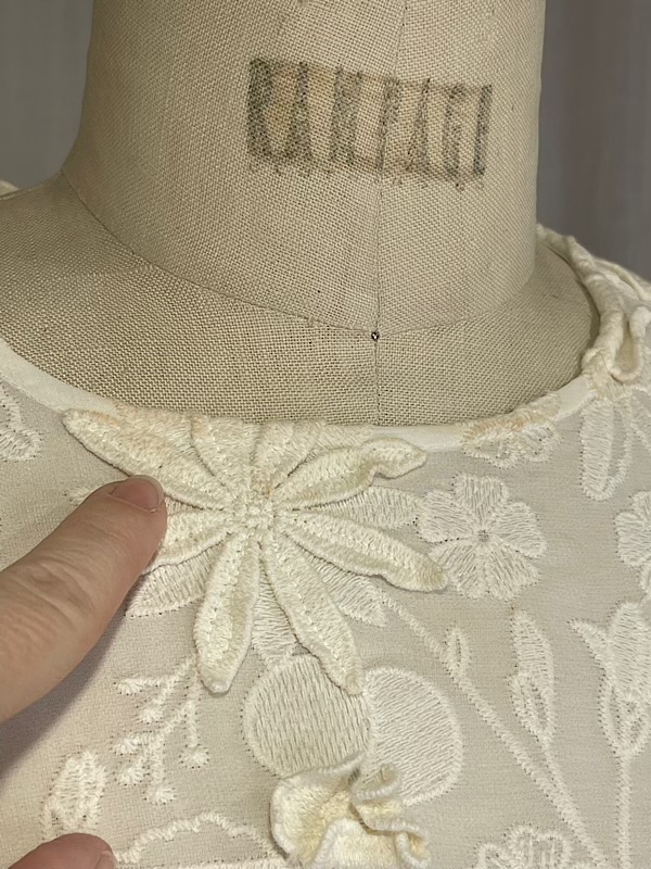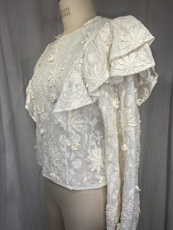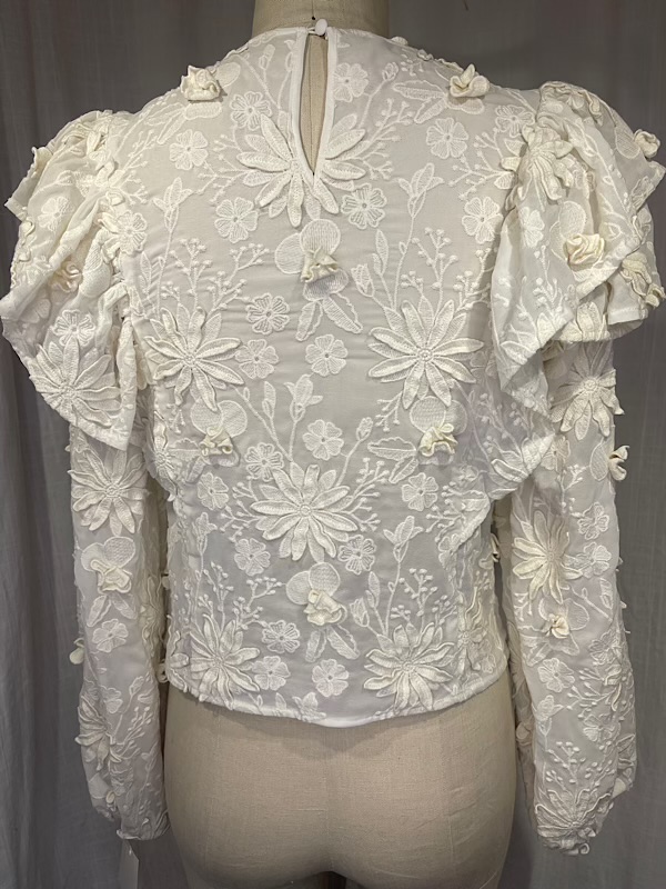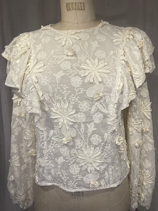 Excellent condition. Beautiful beige floral lace applique peasant style blouse. Elastic at cuffs. Key hole design on back. Some faint make-up on neckline (see pic)
