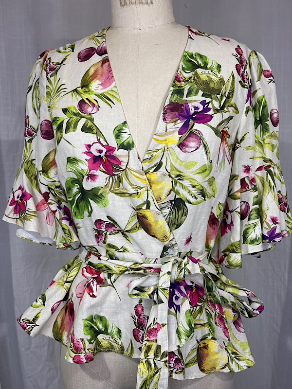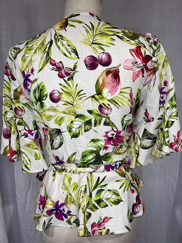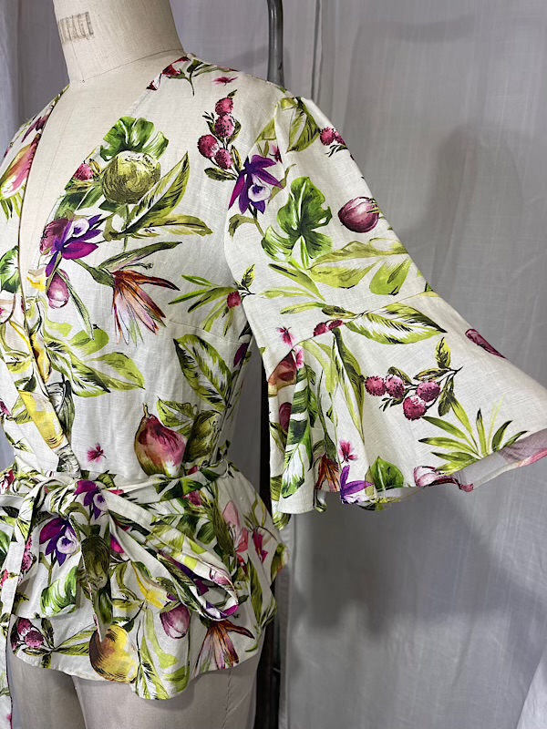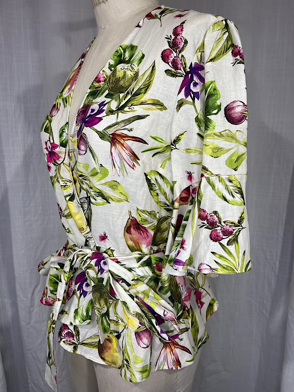 Vintage Inspired 70s Floral & Fruit Linen Wrap Blouse