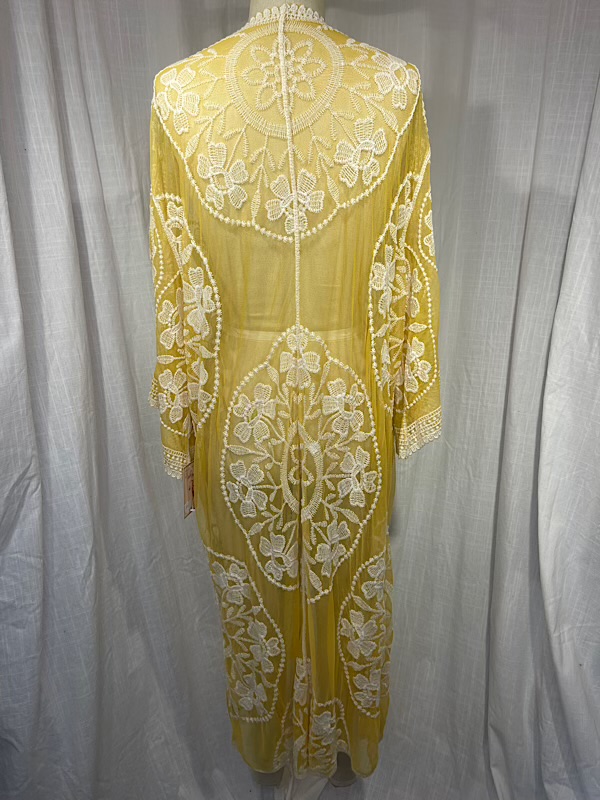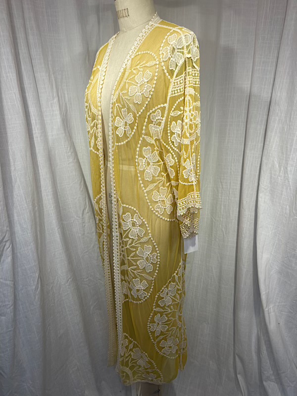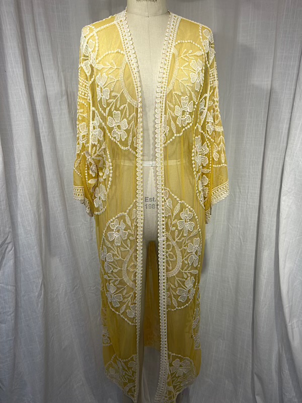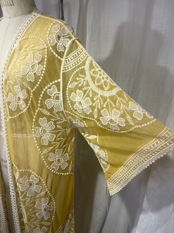 Excellent condition. Beautiful mustard yellow semi-sheer knit floral embroidered long shawl. Kimono style sleeves.