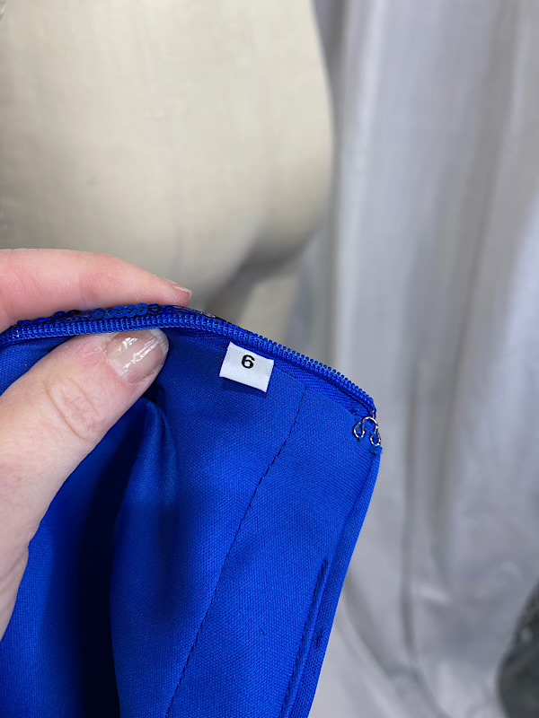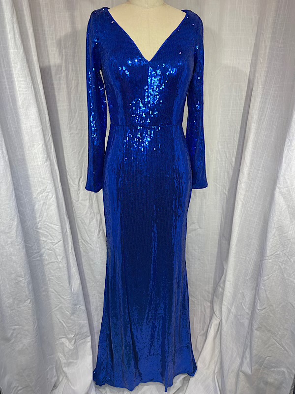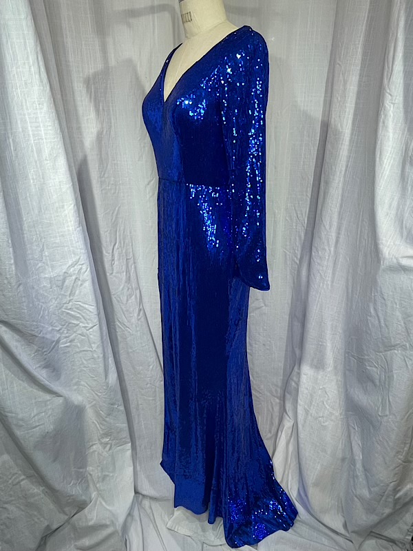 Excellent condition. Beautiful blue long sequin evening gown with slit. Mermaid silhouette. Bust padding. Center back zipper.