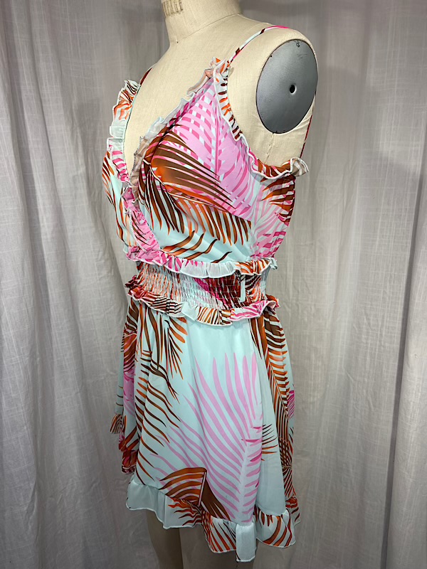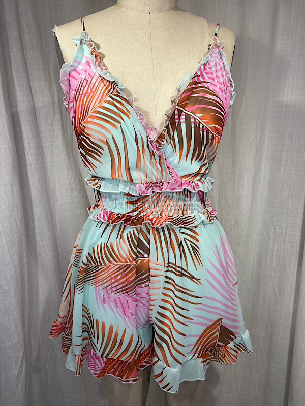Vintage Inspired Turquoise Palm Frond Print Romper