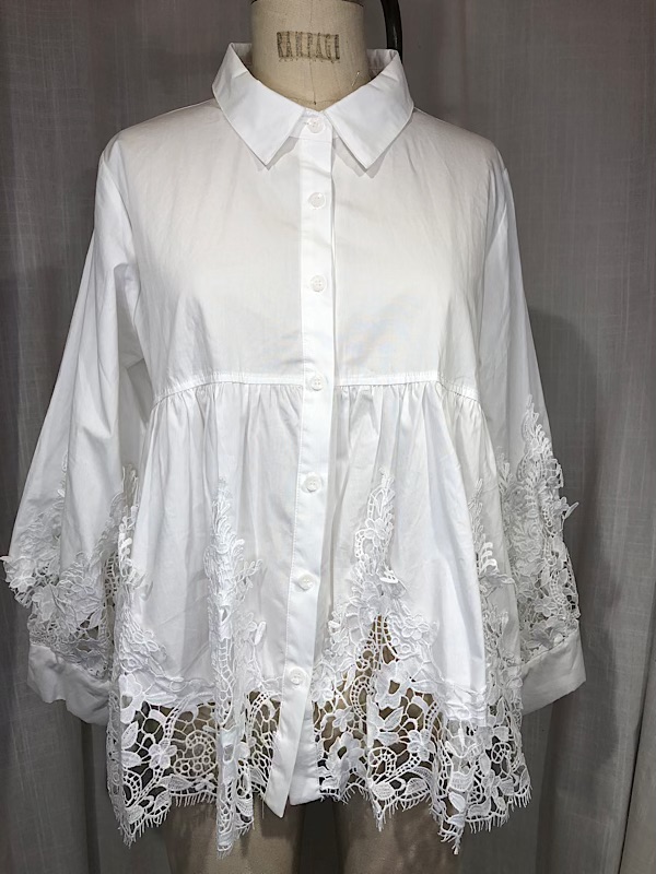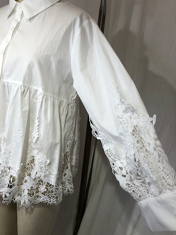 Excellent condition. Beautiful white button-down blouse with Juliet style sleeves. Hem is floral lace. Peplum style. Fabric has some stretch.