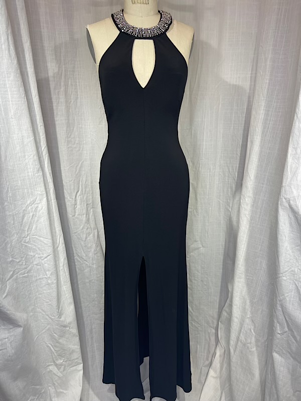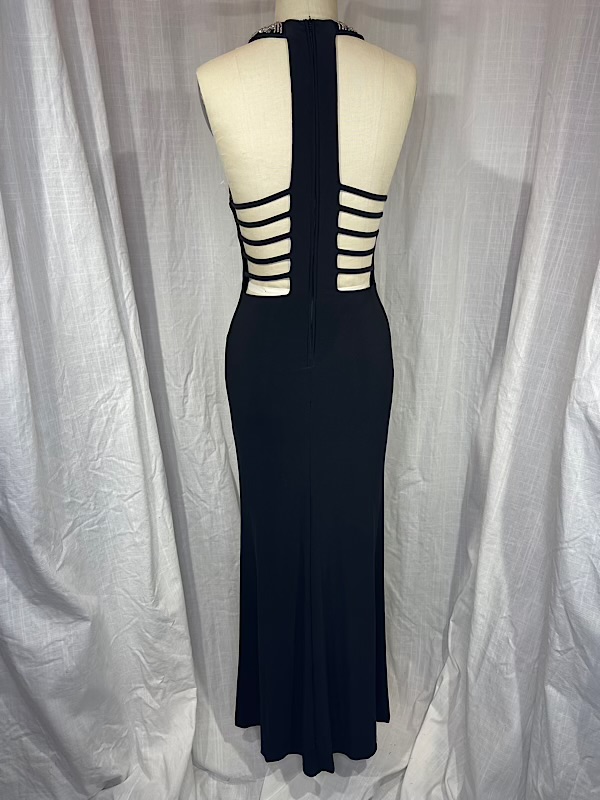 Excellent condition. Beautiful black stretch knit long evening dress with cut-outs at waist. Collar has rhinestones and beads. Slit up the front. Center back zipper. Light bust padding.