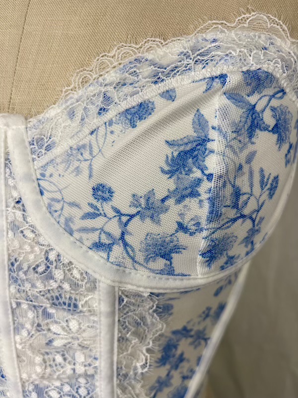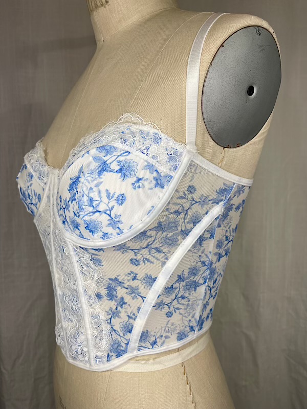 Excellent condition. Beautiful white and blue semi sheer stretch floral print bustier with lace detailing. Underwire. Adjustable elastic straps. Hook and eye closure. Boning at seams.
