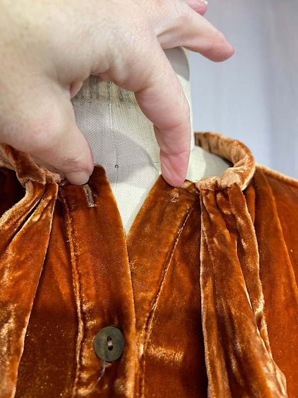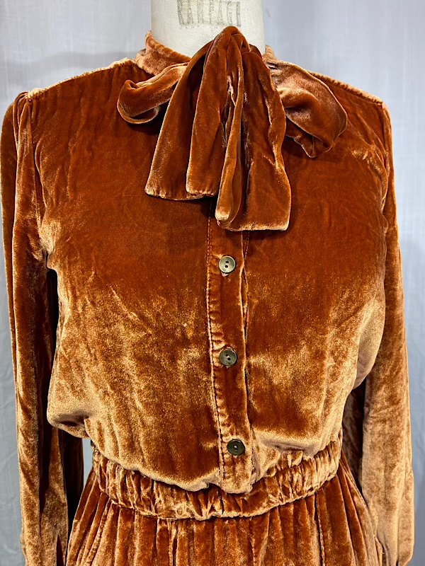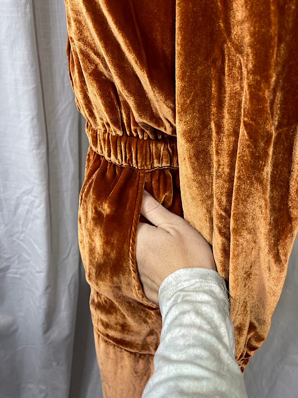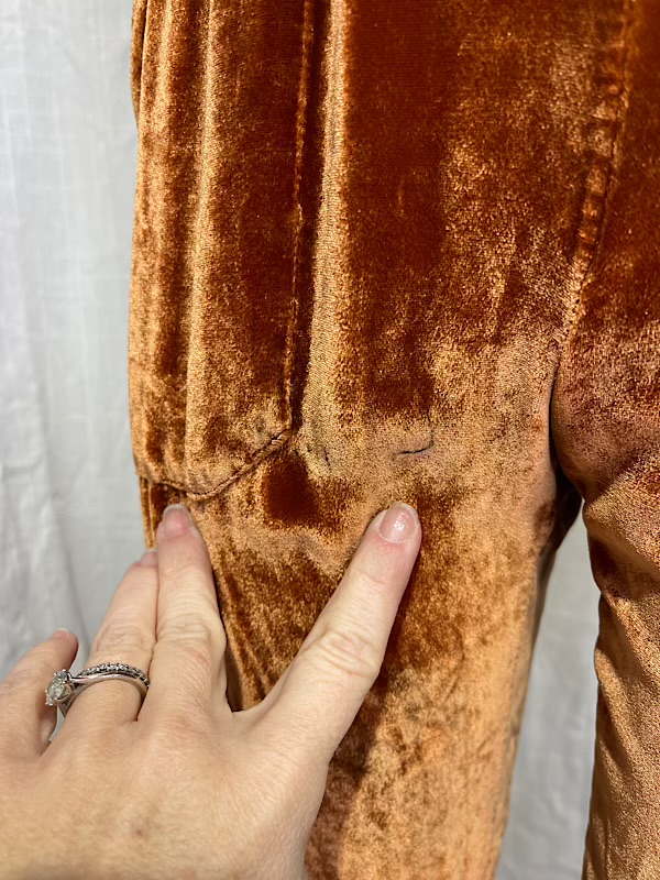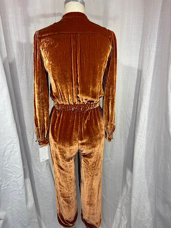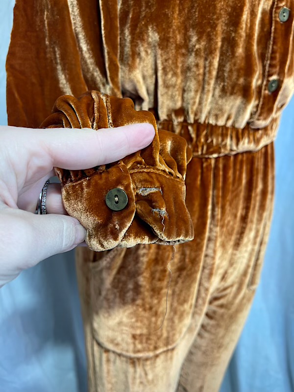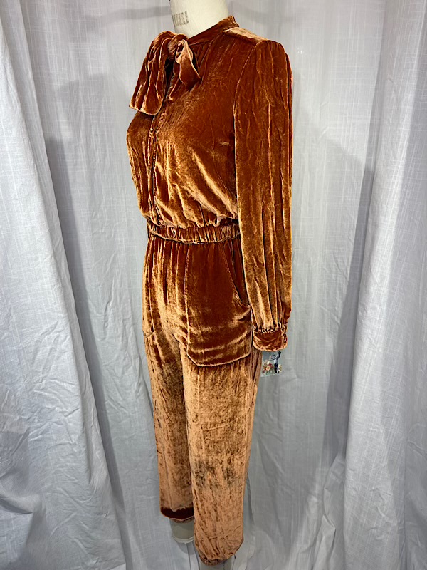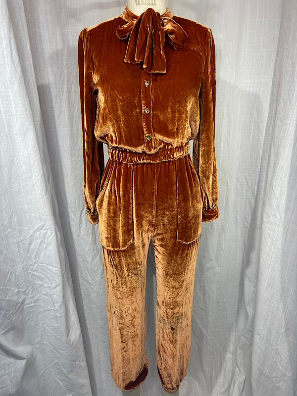 Excellent /very good condition. Beautiful silk velvet jumpsuit with jabot. Elastic at cuffs. Missing one button at cuff and neck (see pics) Two pockets, elastic at waist. Small pen mark near one pocket (see pic)