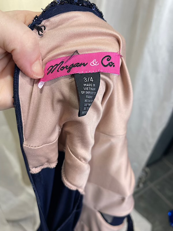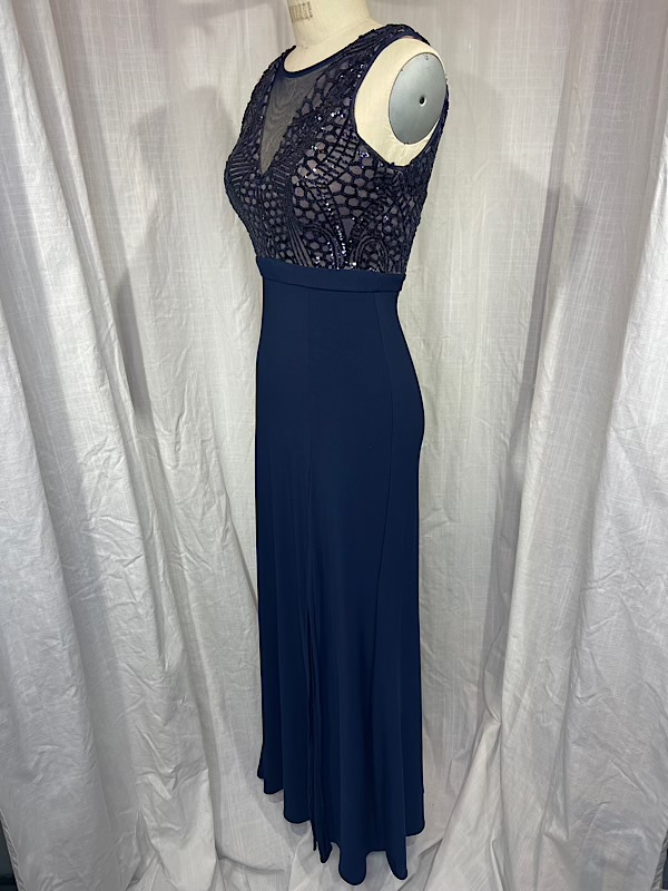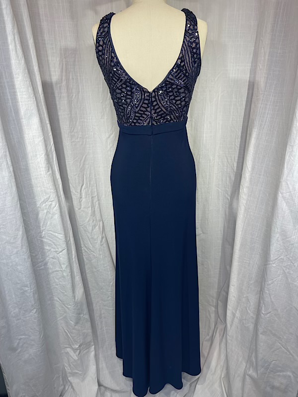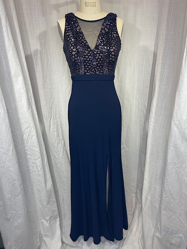 Excellent condition. Beautiful navy long evening dress with sequin bust. Fully lined. Center back zipper. Slit on one side. Bust padding.