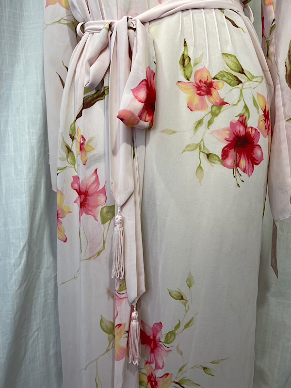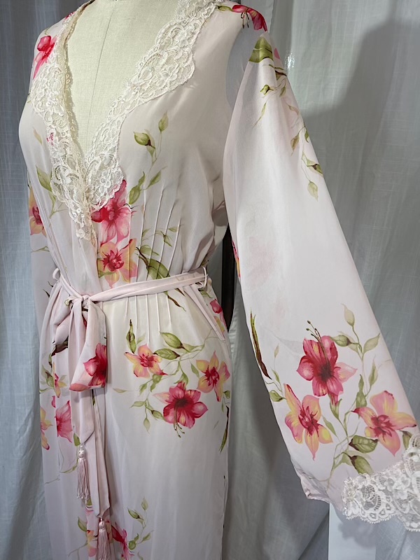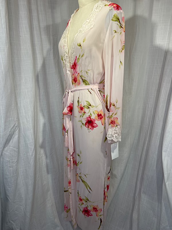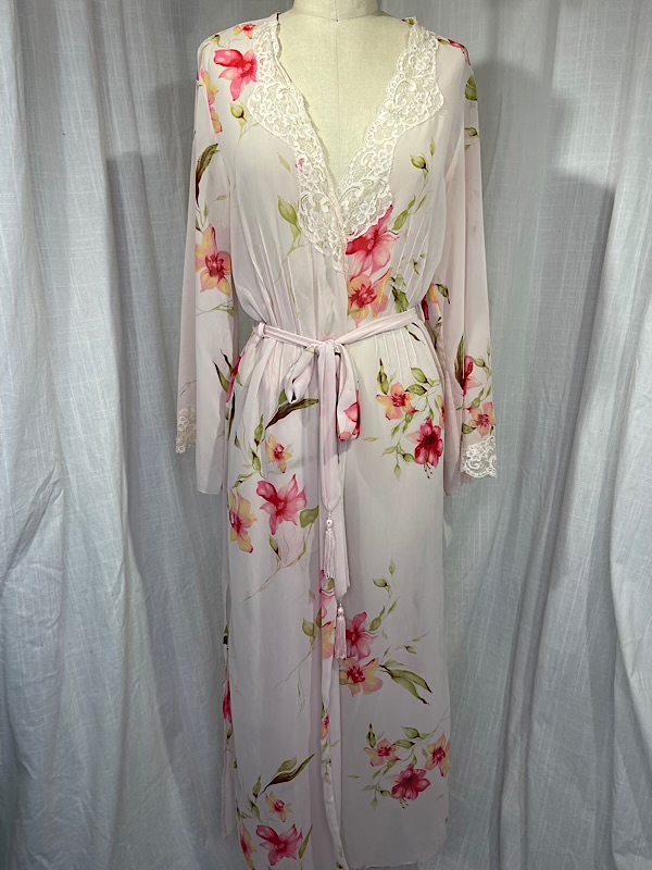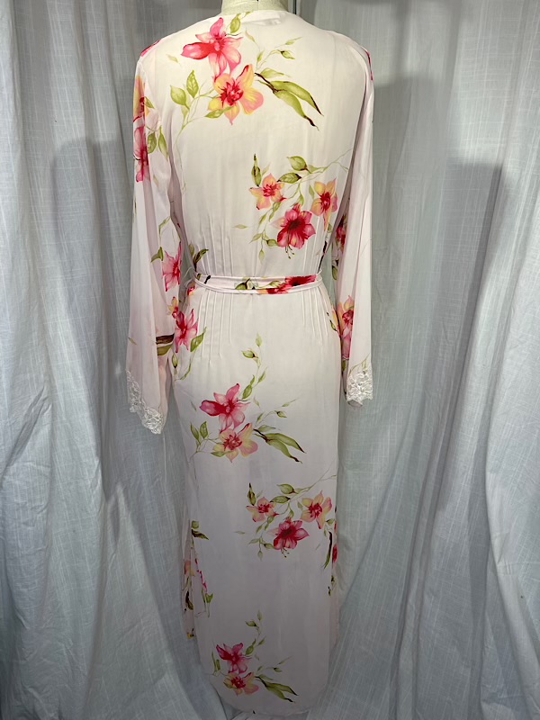 Excellent condition. Beautiful pink semi-sheer floral print long robe wit lace detailing. Ties at waist. Some beads scattered on the lace. It comes with a belt that is trimmed with tassels.