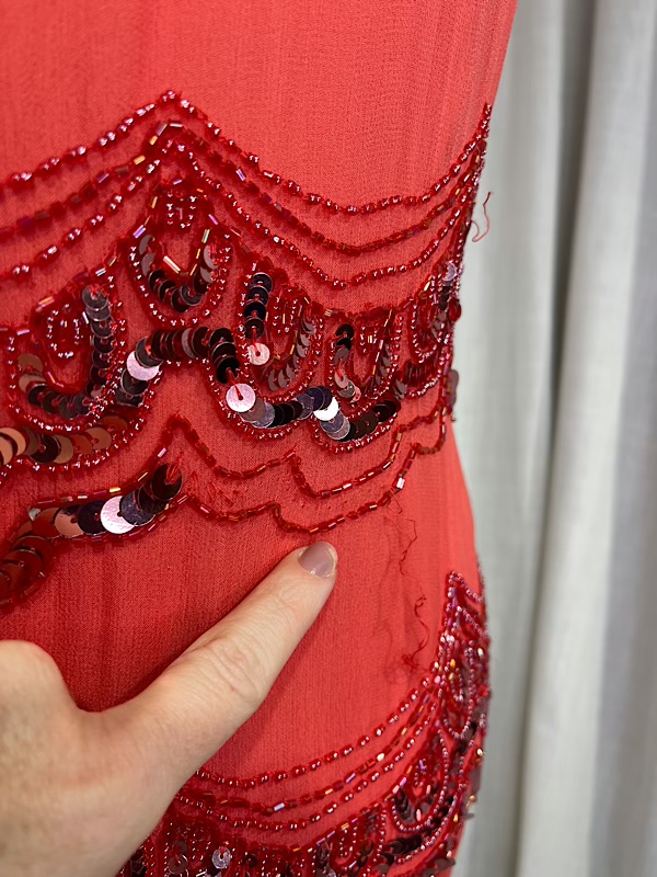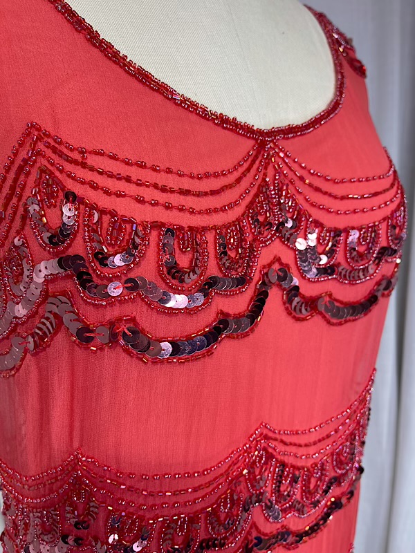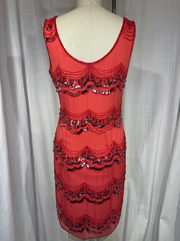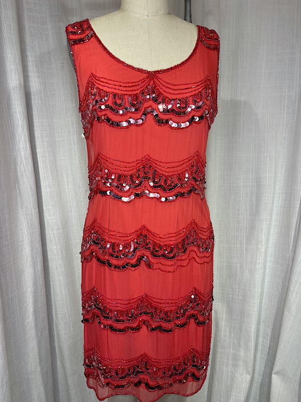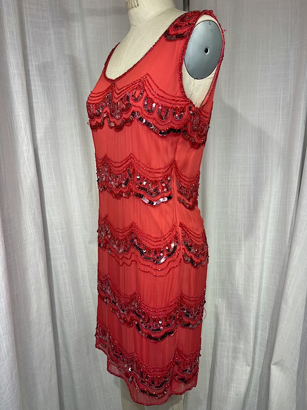 Very good condition. Beautiful red/orange dress with Art Deco sequin beading. Area on back that has some missing beading (see pic) Fully lined. Side seam zipper.