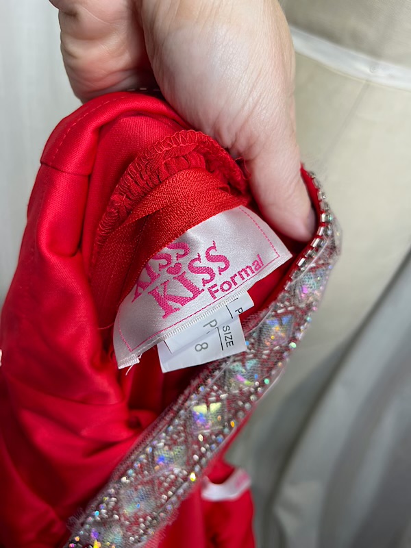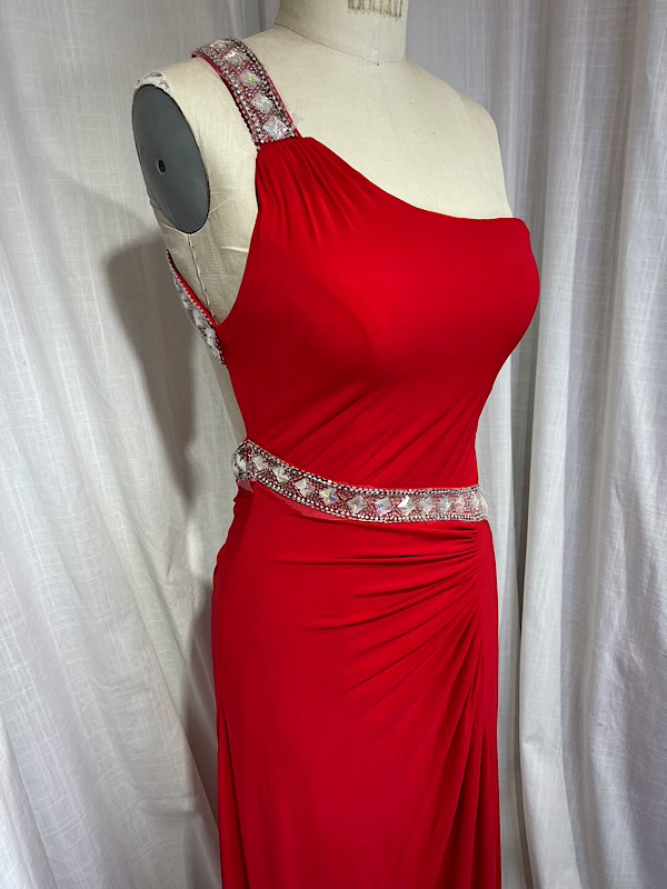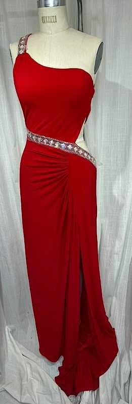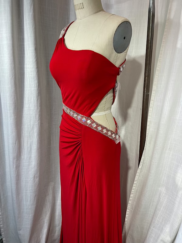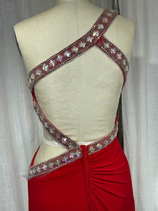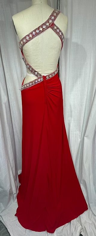 Never worn. Excellent condition. Beautiful red jersey knit evening gown with cut out back design. Rouched on one hip. Slit on left seam. Mermaid train. Center back zipper with hook and eye closure. Bust padding. Fully lined. Rhinestone are covered in white netting that needs to be removed before dress is worn.